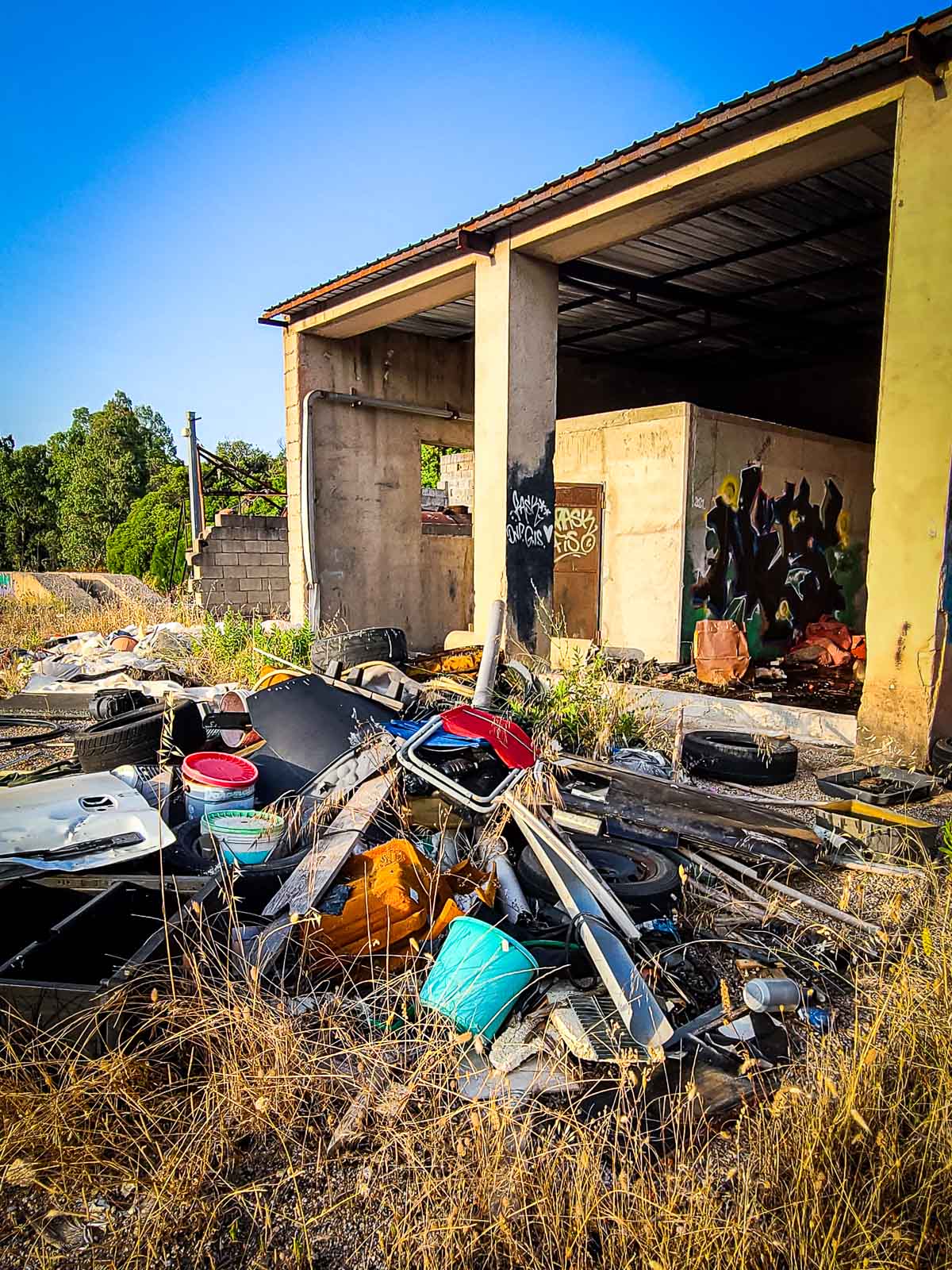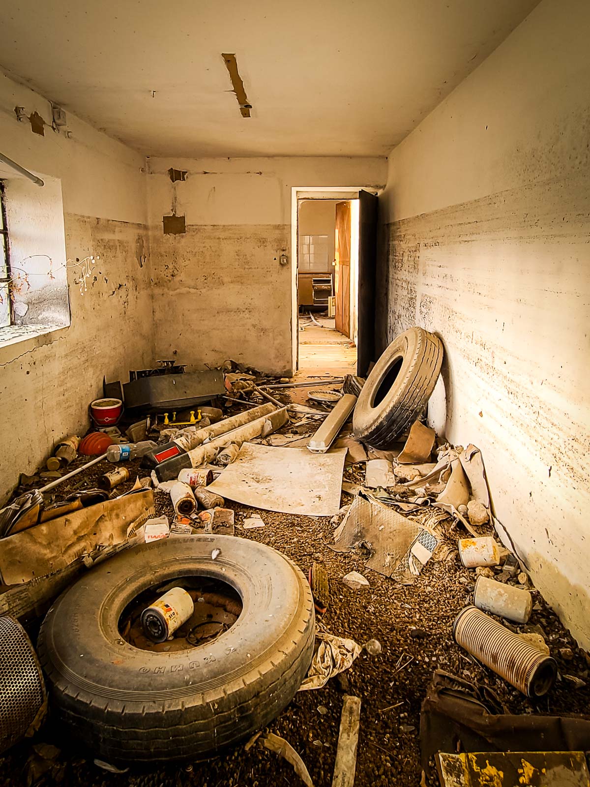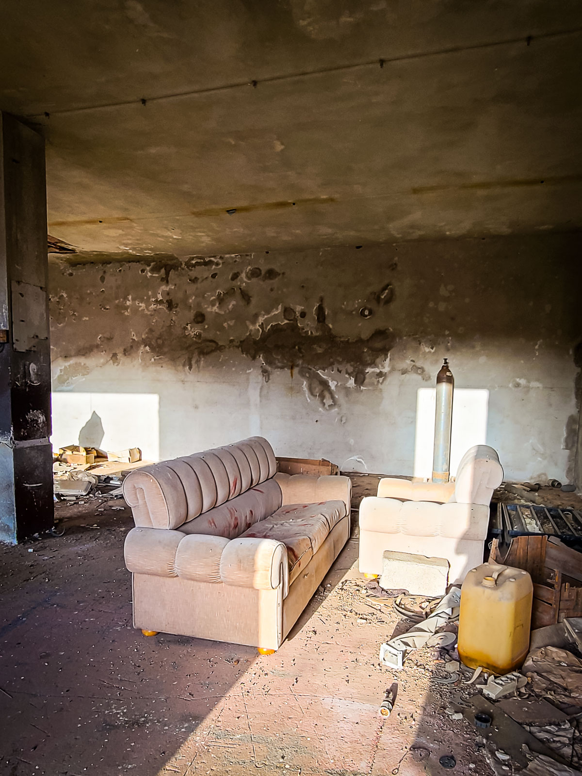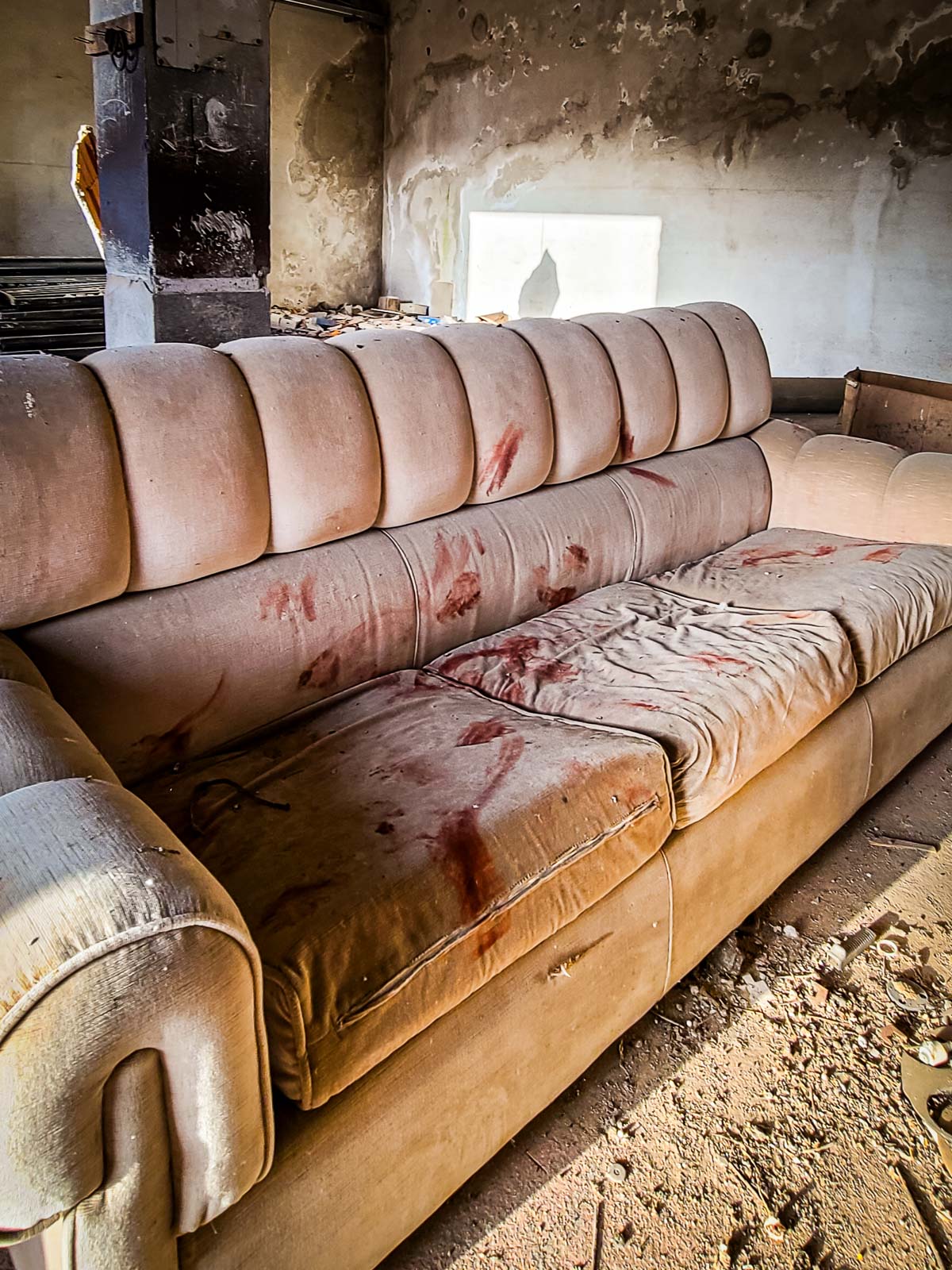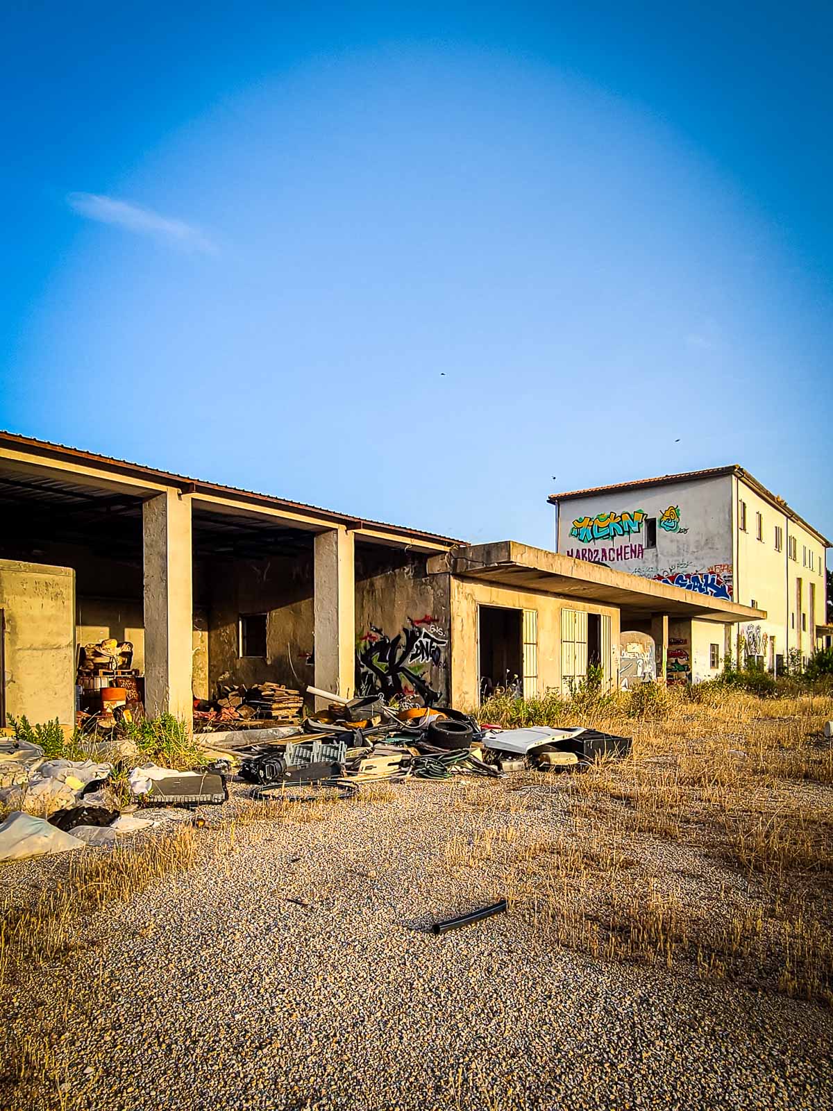 Ici, pour de vrai, un garage vraiment pas rassurant… Je suis seule au beau milieu des routes Sardes et me voilà à explorer cet espace où je vais trouver, je dois m’y résoudre, un canapé marqué de taches de sang. Pas de taches animales de toute évidence, ni de peinture. J’ignore ce qui s’est passé jadis ici… Mais le climat n’est pas bien sécurisant…
