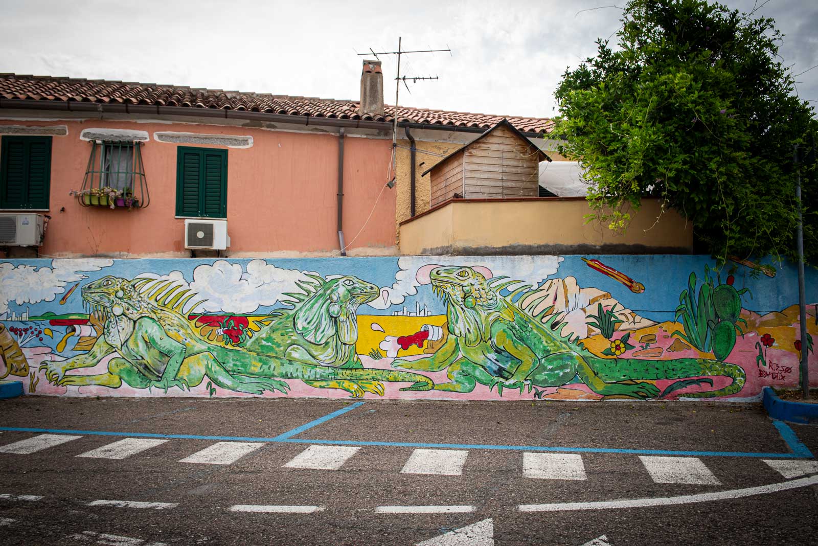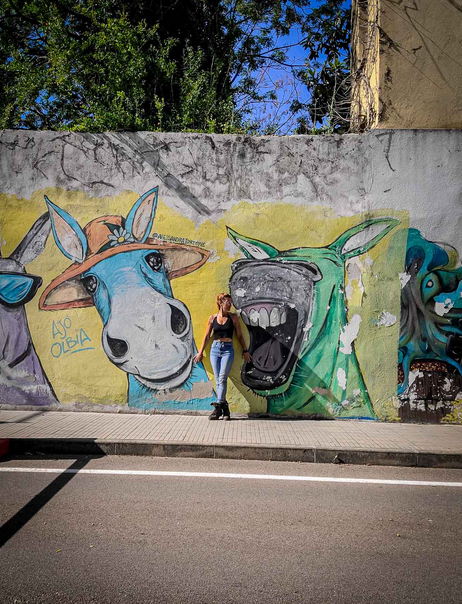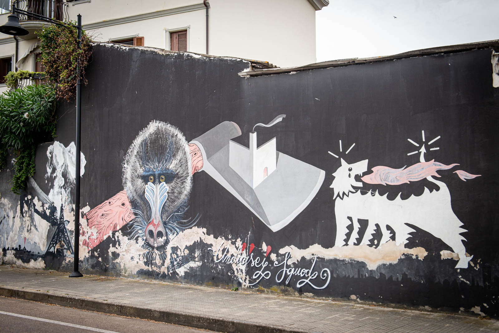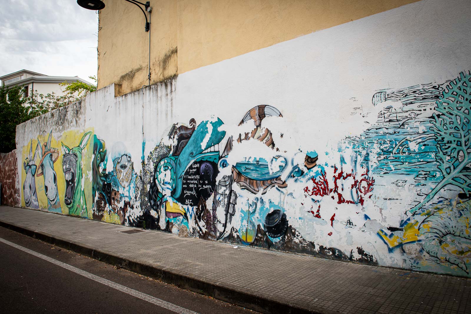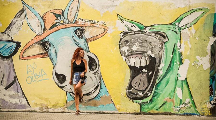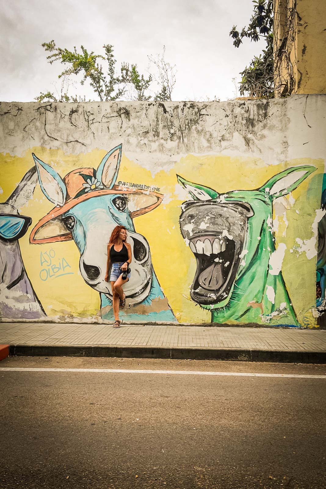 En route pour le sud de l’île de la Sardaigne, je ne peux m’empêcher de faire une halte à Olbia sachant très bien ce que je viens y chercher : cet espace de graffiti tout à fait singulier qui parle de la mer essentiellement. Pour la 3eme année consécutive, je vois le temps caresser les pigments et décharner peu a à peu les peintures originales. Et si chaque année je pouvais refaire cette même photo, devant la fresque des ânes ?…
