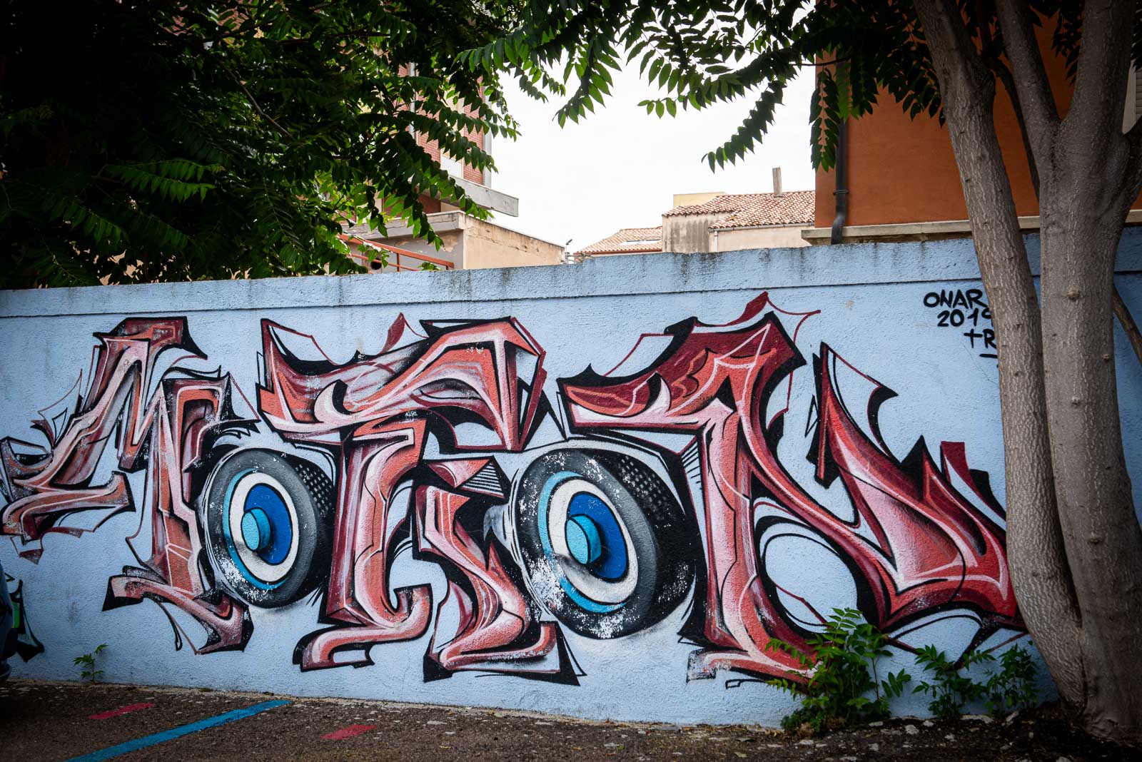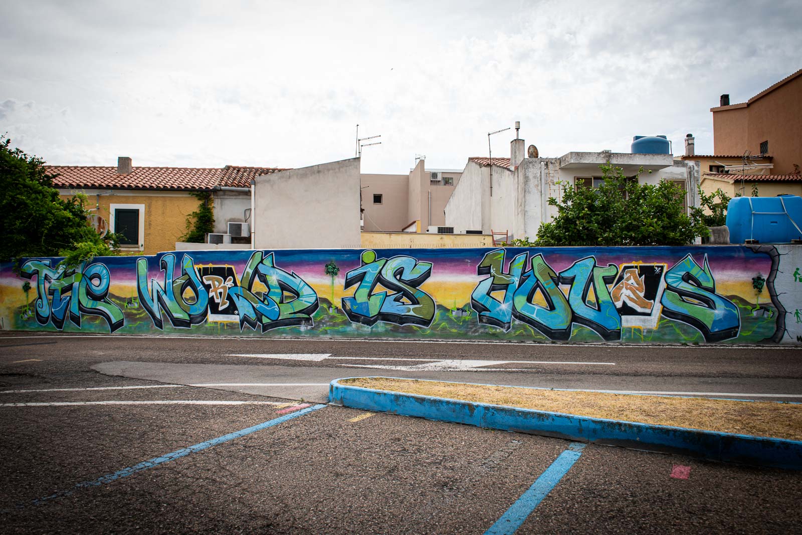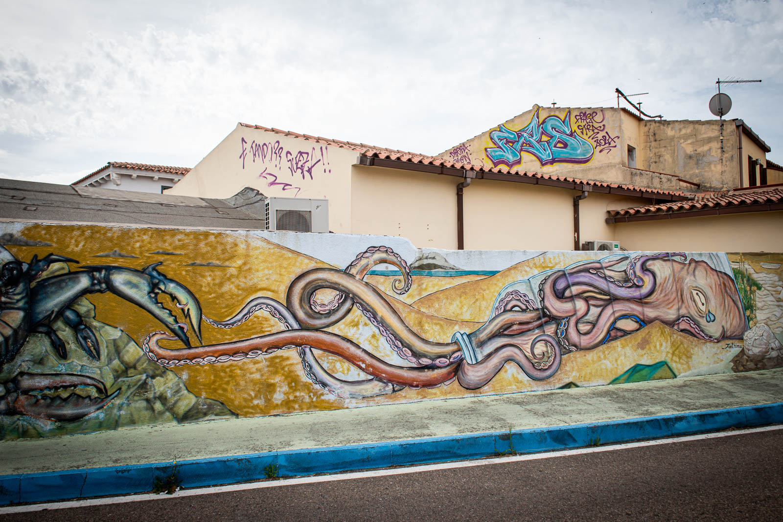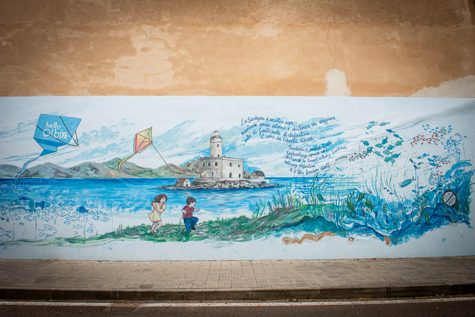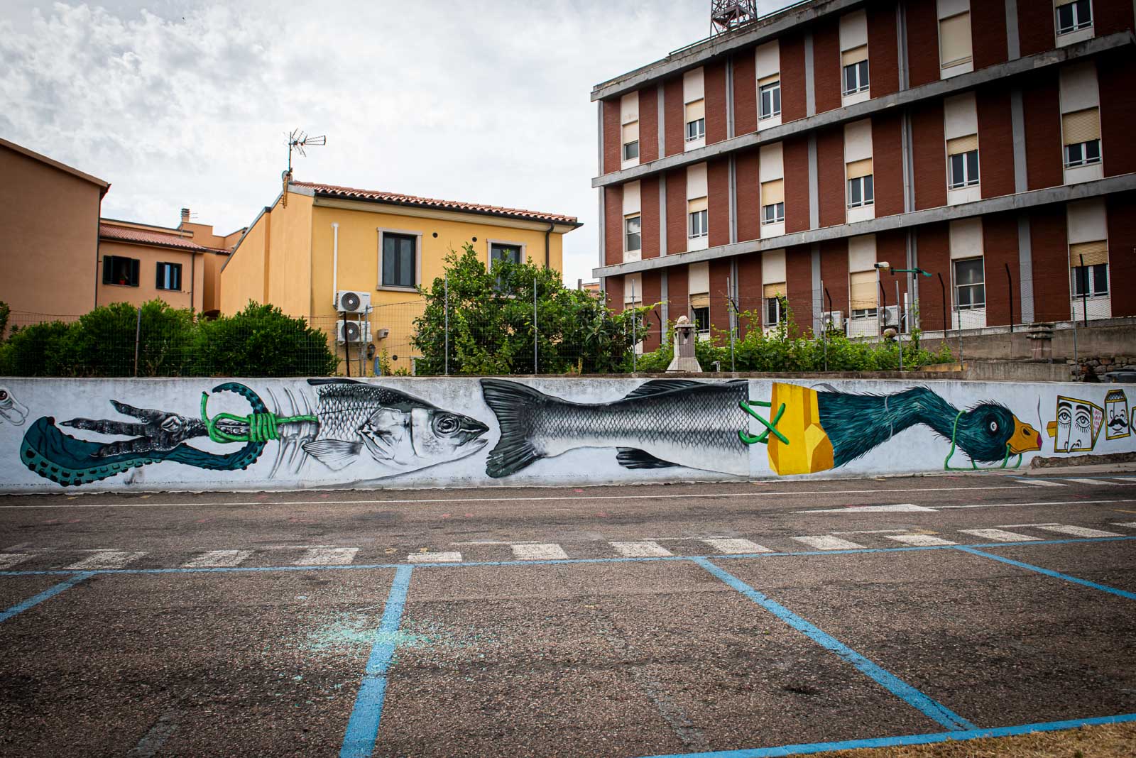 En route pour le sud de l’île de la Sardaigne, je ne peux m’empêcher de faire une halte à Olbia sachant très bien ce que je viens y chercher : cet espace de graffiti tout à fait singulier qui parle de la mer essentiellement. Pour la 3eme année consécutive, je vois le temps caresser les pigments et décharner peu a à peu les peintures originales. Et si chaque année je pouvais refaire cette même photo, devant la fresque des ânes ?…