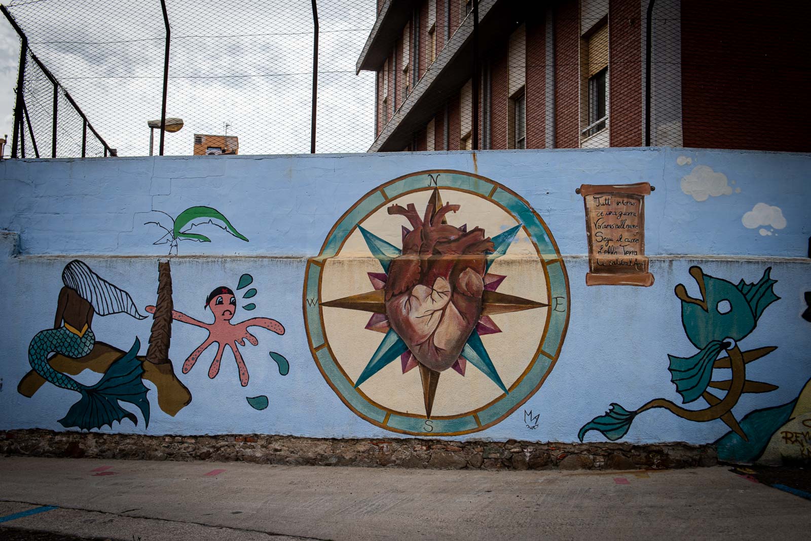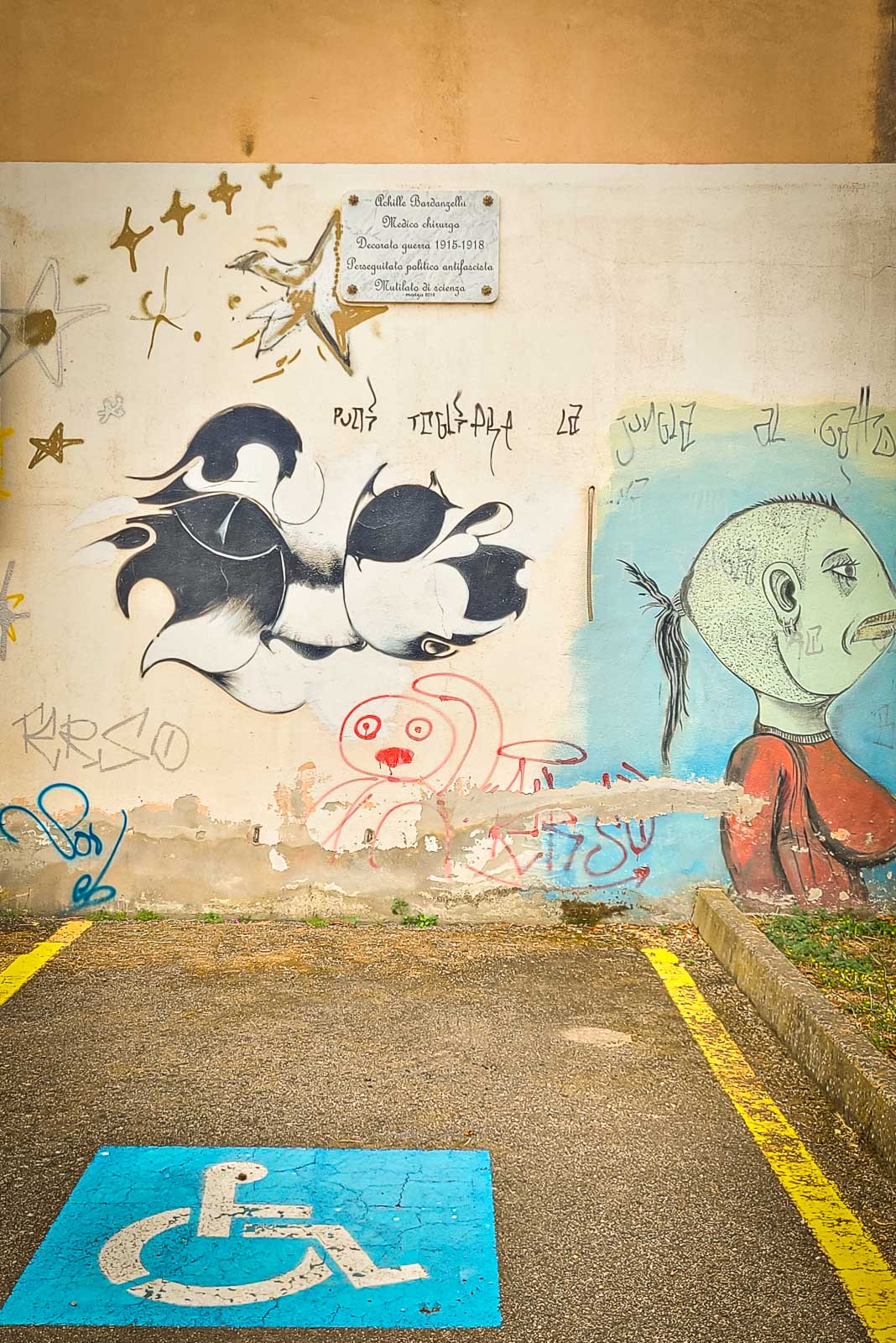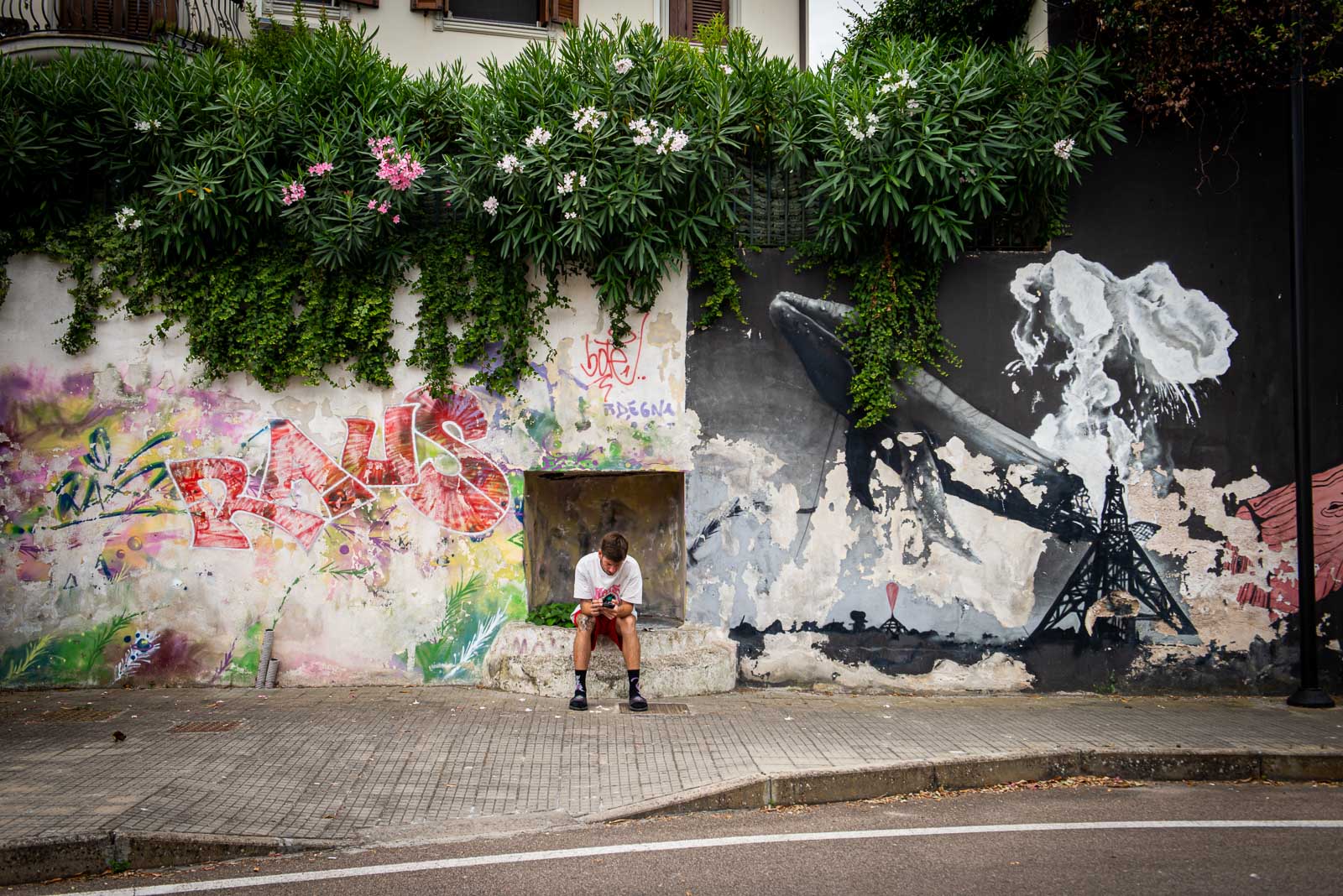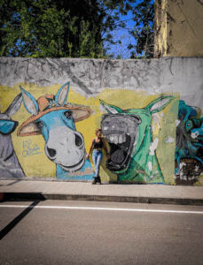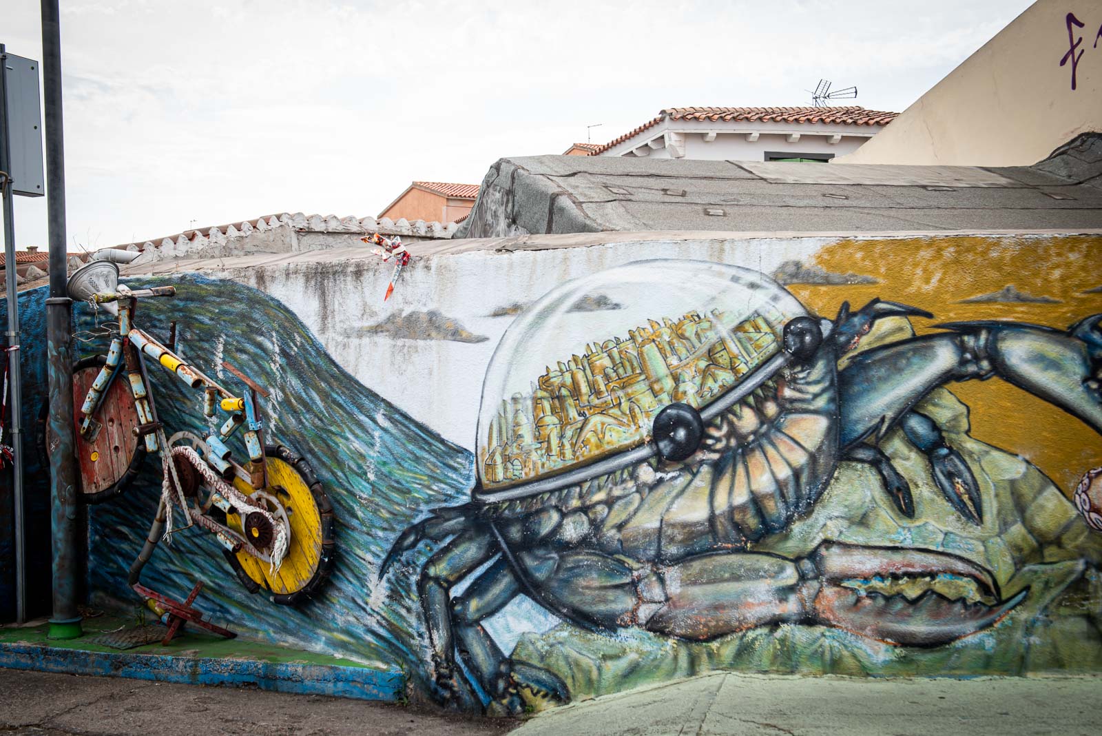 En route pour le sud de l’île de la Sardaigne, je ne peux m’empêcher de faire une halte à Olbia sachant très bien ce que je viens y chercher : cet espace de graffiti tout à fait singulier qui parle de la mer essentiellement. Pour la 3eme année consécutive, je vois le temps caresser les pigments et décharner peu a à peu les peintures originales. Et si chaque année je pouvais refaire cette même photo, devant la fresque des ânes ?…